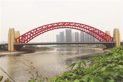 與云龍灣大橋一箭之隔的天保灣大橋全長880米,主跨230米,橋?qū)?3.5米,采用中承式鋼桁架拱橋施工工藝。目前為成都市同類型橋梁中跨度最長、橋梁樣式新穎、技術(shù)含量高、施工工序復(fù)雜,且跨越錦江涉水施工。