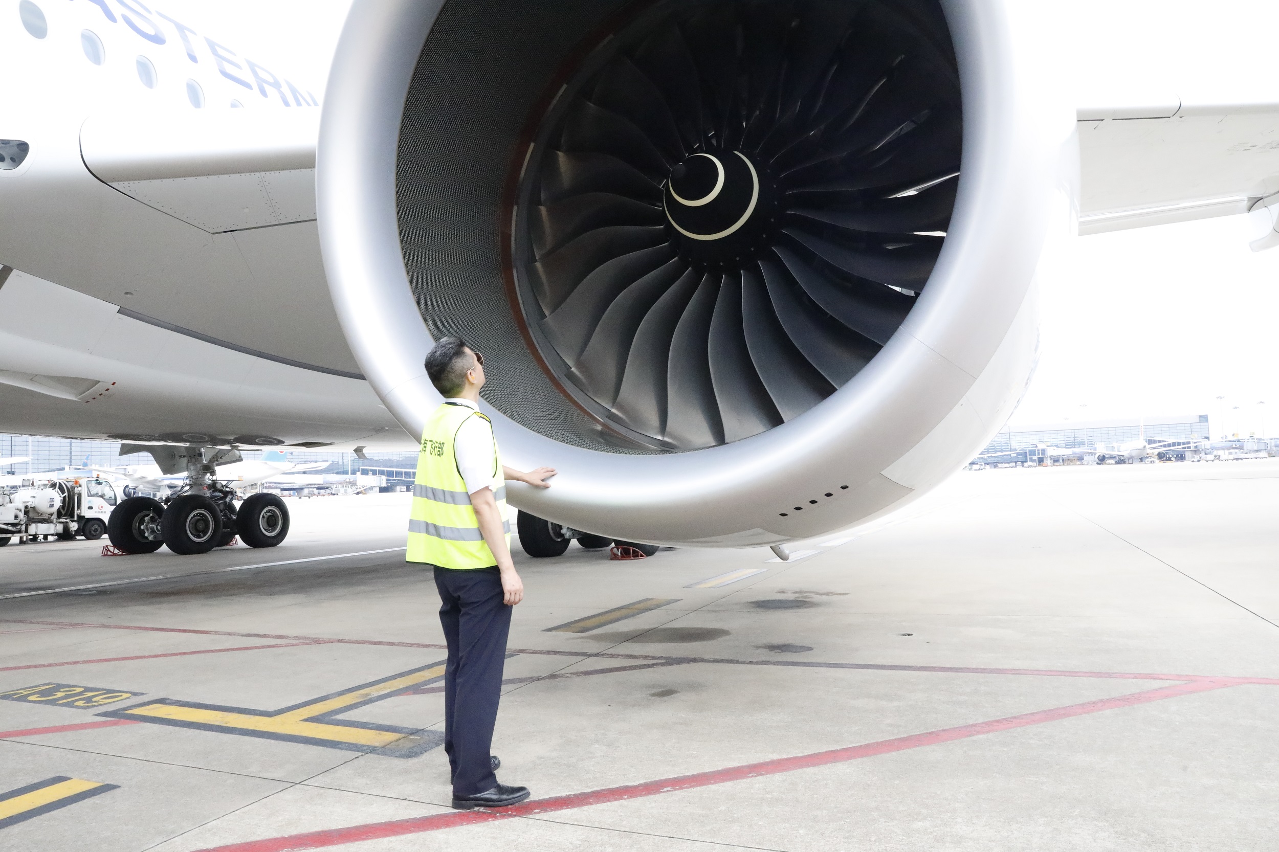 東航A350機(jī)長(zhǎng)季紅華正在進(jìn)行航班起飛前的繞機(jī)檢查工作