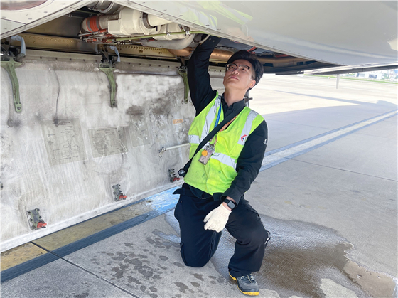 8月4日早晨6時30分,隨著臺風“卡努”轉(zhuǎn)道離境,上海虹橋國際機場持續(xù)整晚的大雨漸漸停歇,大批出港航班開始進行航前準備工作,機坪上擺渡車、客梯車、行李車往返穿梭,工作人員步履匆匆,一派忙碌景象。東航技術(shù)公司虹橋維修基地空客航線一分部的“80后”放行工程師裘磊此時已經(jīng)冒雨在285橋位前忙碌了近一個小時,從上海出發(fā)飛往青島的MU9979航班即將起飛,這是東航今日在虹橋機場執(zhí)行的第一批出港航班之一,有120余名旅客正在客艙內(nèi)等候開啟他們的暑期行程。