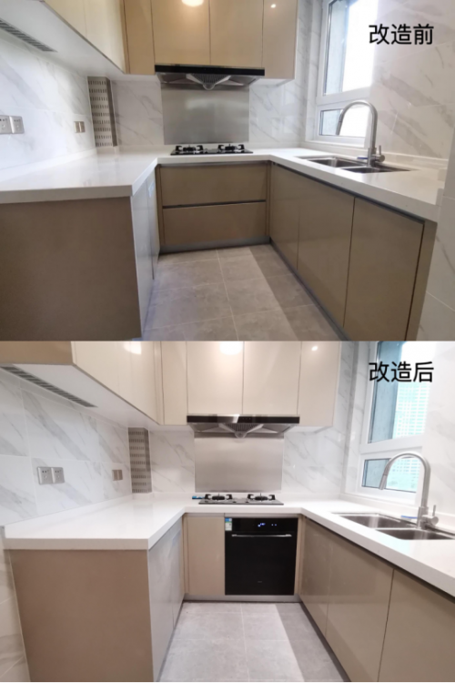 老板電器“無憂廚改”項目洗碗機改造效果,(上)改造前,(下)改造后