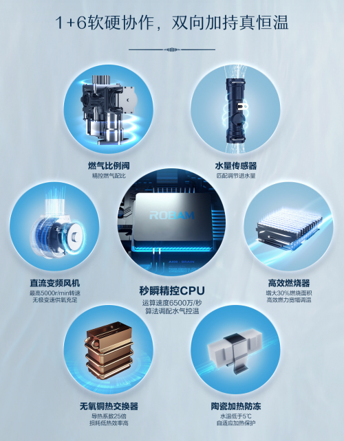 硬件上,【川】系列燃?xì)鉄崴鱄T730搭載秒瞬精控CPU,內(nèi)置全新升級(jí)的PID智能算法,可達(dá)6500萬/秒超速運(yùn)算,精準(zhǔn)計(jì)算水氣配比,使燃?xì)獗壤y和水量傳感器快速響應(yīng),迅捷精控持久恒溫。水流量傳感器,可精準(zhǔn)調(diào)節(jié)進(jìn)出口水量,在CPU的配合下實(shí)現(xiàn)水溫恒定;燃?xì)獗壤y,實(shí)時(shí)精控燃?xì)庥昧?#xff0c;高能效穩(wěn)定控溫;高效燃燒器,創(chuàng)新增氧V型火排,增大30%燃燒面積,增強(qiáng)89.68%燃燒效率,削弱15%運(yùn)行噪音,分段穩(wěn)然技術(shù)讓小火中火大火靈活調(diào)控,實(shí)現(xiàn)35-60℃寬幅調(diào)溫。直流變頻風(fēng)機(jī),最高5000r/min轉(zhuǎn)速無極變速高效供氧充足。高效無氧銅熱交換器,除了導(dǎo)熱性耐腐蝕性出色,還具備更強(qiáng)的熱沖擊性能。陶瓷加熱防凍,當(dāng)水溫低至5℃,四個(gè)陶瓷加熱器便會(huì)啟動(dòng)加熱保護(hù),無懼國內(nèi)高寒天氣,-20℃也能安心熱浴。1+6的軟硬件協(xié)作,便可讓【川】系列燃?xì)鉄崴鱄T730輸出澎湃熱水,給予你舒適的沐浴體驗(yàn)與不間斷的溫暖關(guān)懷。