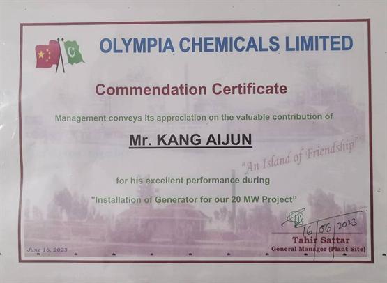 值得一提的是,發(fā)電機各項數(shù)據(jù)經(jīng)過業(yè)主檢測基本都在中間公差,巴基斯坦OLYMPIA CHEMICALS公司管理層對舜云互聯(lián)提供的服務和售后服務人員所展現(xiàn)出的精湛的技術,高度的責任感和使命感表示高度認可,并頒發(fā)了《表揚證書》。