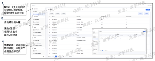 歐孚科技運用低代碼技術搭建了“物資進-出項“管理模塊。該模塊包括搭建SKU庫,對物資物料進行統(tǒng)一定義;配置采購調度的表單公式,使區(qū)域站點能根據(jù)實際領用情況進行填寫;根據(jù)各站點領用數(shù)據(jù),快速統(tǒng)計物料成本并進行庫存盤點管理。