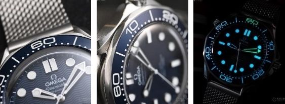 新款海馬系列300米潛水表詹姆斯·邦德60周年紀(jì)念版精鋼款,表殼尺寸為42毫米,表殼10點(diǎn)位是排氦閥,這些和常規(guī)海馬300米一樣。第一個需要注意的特點(diǎn)是,手表的表圈,是鋁圈。藍(lán)色的鋁圈,顏色偏暗。之所以不用陶瓷圈,而使用鋁圈,就是為了模仿早期海馬300米的樣式。表圈上的第二個特點(diǎn)是,表圈零位的數(shù)字刻度,是60,而不是常規(guī)海馬300米的“倒三角”。使用數(shù)字60,以突出“邦德60周年”紀(jì)念。同時,鋁圈上的所有數(shù)字刻度,都有夜光。