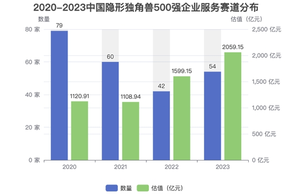 報(bào)告顯示,2023中國隱形獨(dú)角獸500強(qiáng)企業(yè)服務(wù)賽道獨(dú)角獸企業(yè)有54家,估值合計(jì)為2059.15億元(如上圖)。根據(jù)BIHU創(chuàng)業(yè)伯樂獨(dú)角獸企業(yè)數(shù)據(jù)庫(EMUDB),2021-2023中國隱形獨(dú)角獸500強(qiáng)企業(yè)服務(wù)賽道隱形獨(dú)角獸企業(yè)同比分別減少19家、減少18家、增加12家;企業(yè)服務(wù)賽道隱形獨(dú)角獸企業(yè)估值合計(jì)同比分別降低1.07%、增長44.21%、增長28.77%。2023年與2022年相比,企業(yè)服務(wù)賽道隱形獨(dú)角獸企業(yè)從42家上漲到54家,增加了12家,漲幅為28.57%,呈現(xiàn)出上升趨勢(shì);估值合計(jì)從1599.15億元上漲到2059.15億元,增長了460億元,漲幅為28.77%,呈現(xiàn)出上升趨勢(shì)。