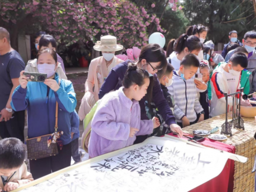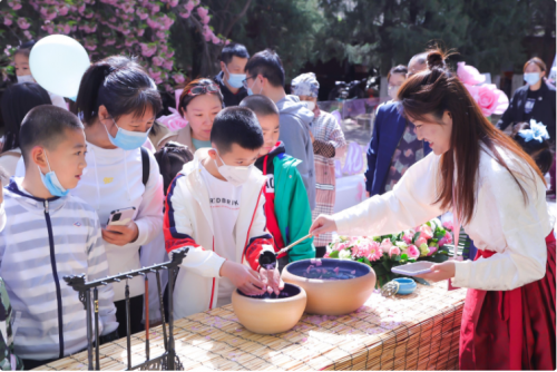 來賓們在賞櫻的同時紛紛錄制有聲明信片“我想對黨說”,體驗各式手作、風(fēng)箏制作、DIY團扇制作、漢服秀等?!霸搅_衫袂迎春風(fēng),玉刻麒麟腰帶紅?!贝荷ㄏ?#xff0c;飄逸的裙裾、精致的簪花,中華傳統(tǒng)服飾之美與絢爛多姿的國潮風(fēng)交相輝映,在水墨香中感受漢字書法的魅力所在,在詩詞之美中,領(lǐng)略詩意人生的寫照、家國情懷的寄托,傳承詩詞文化,涵養(yǎng)民族精神。