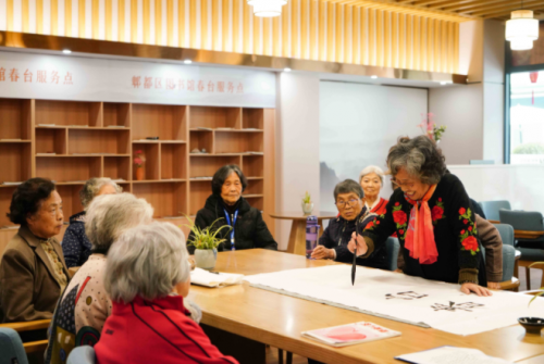 活動(dòng)中,另一位80多歲的阿姨現(xiàn)場(chǎng)書寫了“春臺(tái)書香”四個(gè)大字,寄語(yǔ)書香社區(qū)的營(yíng)建。