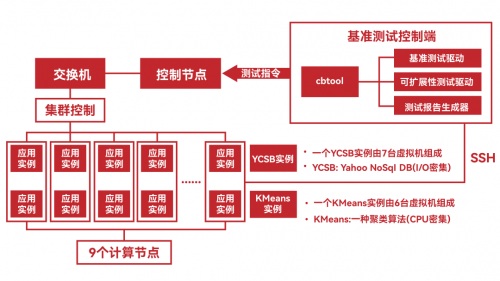 SPEC Cloud IaaS 2018 Benchmark是SPEC開發(fā)的基于大數(shù)據(jù)場景下的云基準標準測試套件,用以衡量云計算的性能,Benchmark基準測試模型主要測試的是IaaS云平臺性能。SPEC Cloud IaaS 2018通過創(chuàng)建NoSQL(Cassandra)實例實現(xiàn)YCSB架構(gòu),其測試項包括吞吐量、插入響應(yīng)時間、讀取響應(yīng)時間、平均應(yīng)用實例(Application Instance)配置時間。SPEC Cloud IaaS 2018基準測試使用HiBench KMeans實現(xiàn)計算密集型測試,測試項包括完成時間、每個應(yīng)用實例運行的Hadoop迭代計數(shù)、平均應(yīng)用實例配置時間。
