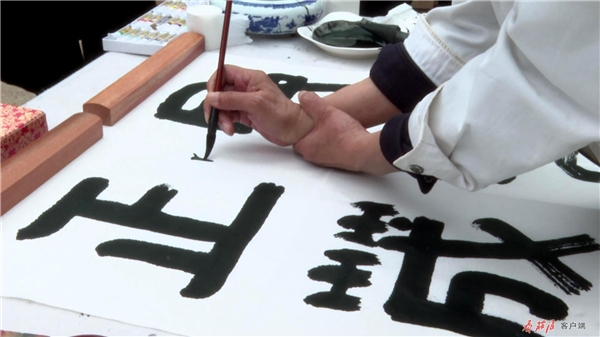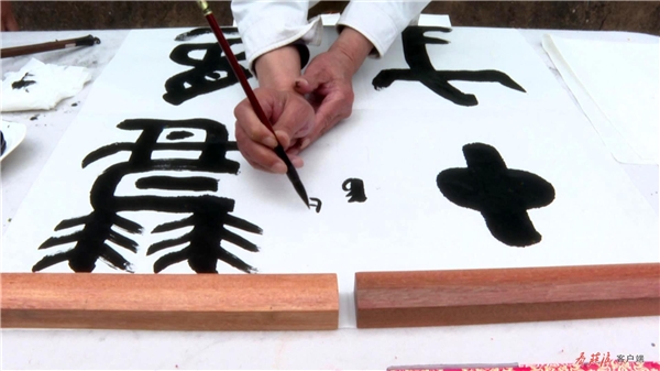 在農(nóng)家小院,閻正正在聚精會神地揮毫潑墨,他在筆墨的運用上別出心裁、匠心獨運,流暢的線條蒼勁有力,書法作品淋漓盡致地展現(xiàn)于尺幅之上。談起他創(chuàng)作的靈感,閻正說,“莊浪歷史悠久、文化底蘊深厚、森林植被覆蓋率高,儼然一幅天然山水畫。莊浪縣云崖寺自然風(fēng)光秀麗,石窟藝術(shù)精美,有遠山、有水庫、有寺廟,它完全具備中國畫的每一個條件?!?/p>