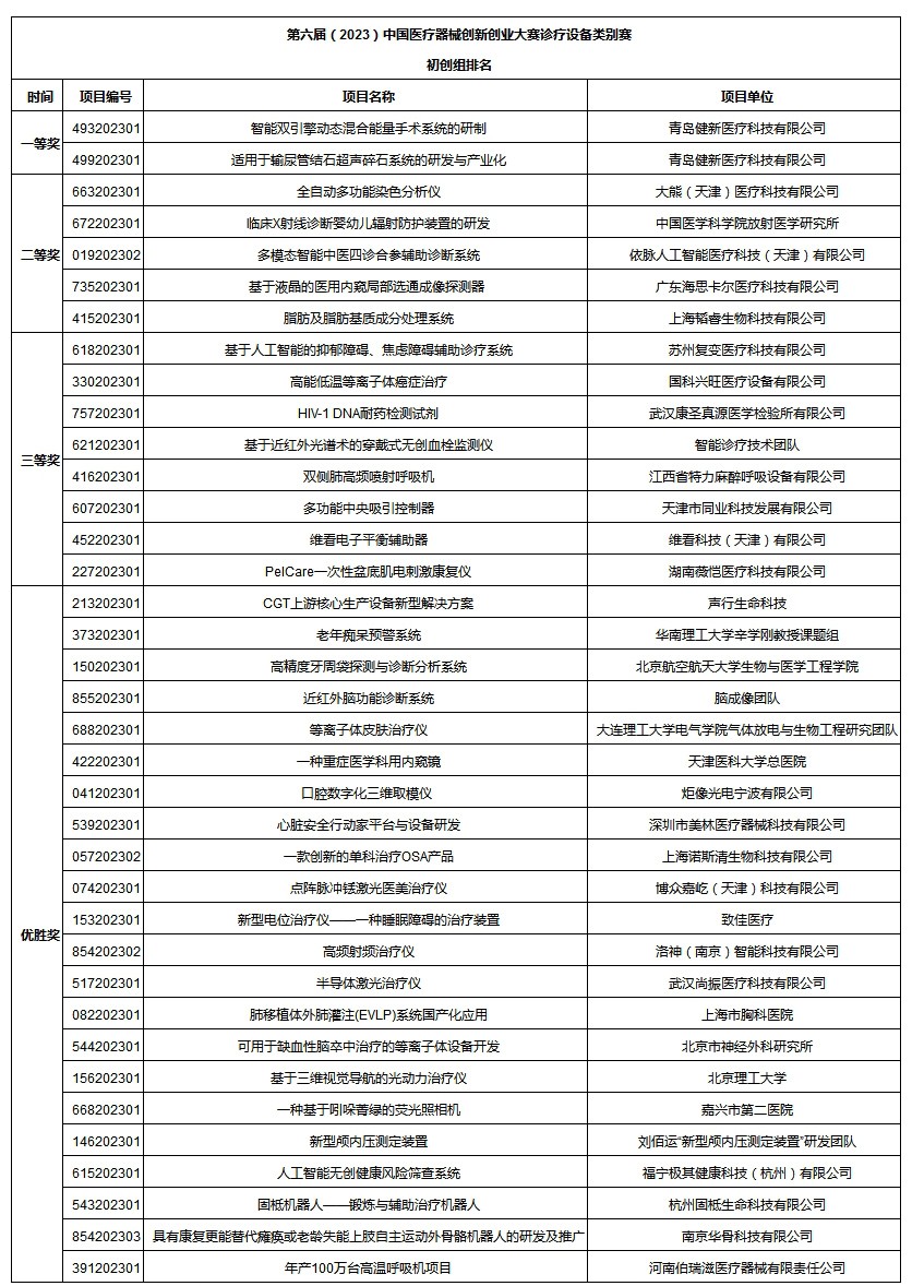 診療設(shè)備類別賽初創(chuàng)組最終評(píng)選出一等獎(jiǎng)2個(gè),二等獎(jiǎng)5個(gè),三等獎(jiǎng)8個(gè),優(yōu)勝獎(jiǎng)21個(gè)。