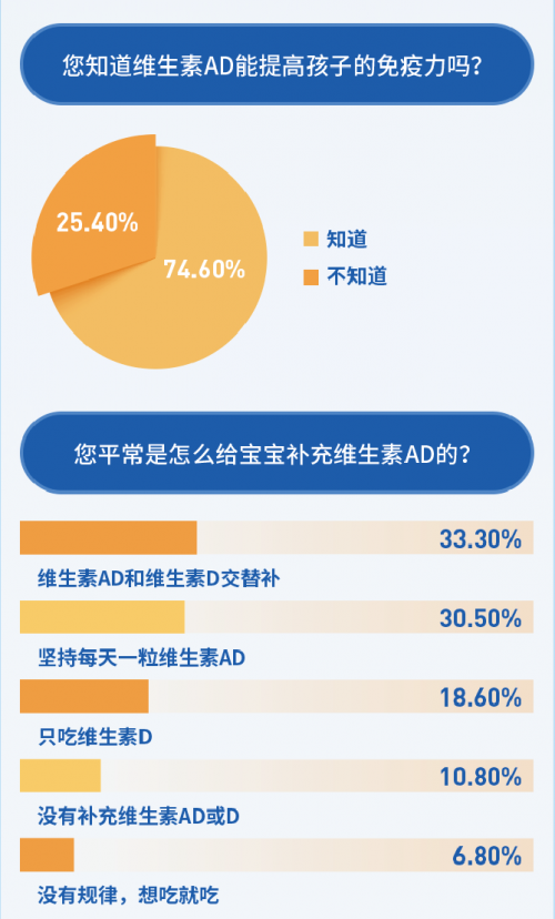 調(diào)查報(bào)告還顯示,雖然7成的家長(zhǎng)認(rèn)可維生素AD對(duì)提高免疫力的作用,但有7成的家長(zhǎng)用錯(cuò)了方法,比如選擇AD和D交替補(bǔ)、只補(bǔ)D不補(bǔ)A、補(bǔ)補(bǔ)停停等。專(zhuān)家提醒,家長(zhǎng)一定要重視孩子日常營(yíng)養(yǎng)的攝入,堅(jiān)持每天補(bǔ)充維生素AD是最佳方案。