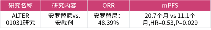 ALTER 01031的Ⅱ期隨機對照研究的結(jié)果表明,對比安慰劑,安羅替尼組的客觀緩解率(ORR)達(dá)到48.39%,可以顯著延長中位無進展生存期(mPFS)達(dá)9.6個月(20.7個月 vs. 11.1個月)[8],為晚期MTC患者帶來顯著的PFS及ORR獲益,并且安全性良好。安羅替尼甲狀腺髓樣癌適應(yīng)癥的獲批,打破了國內(nèi)甲狀腺髓樣癌無靶向藥可用的局面,給患者帶來新希望。
