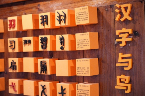 在這個(gè)書屋中,項(xiàng)目團(tuán)隊(duì)別出心裁地規(guī)劃了一個(gè)叫“漢字與鳥”的板塊,包含了從甲骨文到現(xiàn)代所有與鳥相關(guān)的漢字。緊鄰這個(gè)板塊的墻上是一整排純手工制作的傳統(tǒng)卷軸,里面寫滿了與鳥相關(guān)的千古名句。位于大廳正中央的是一幅巨型馬影湖手繪地圖,上面標(biāo)注著當(dāng)?shù)刂饕暮蝤B種類,供參觀者學(xué)習(xí)。