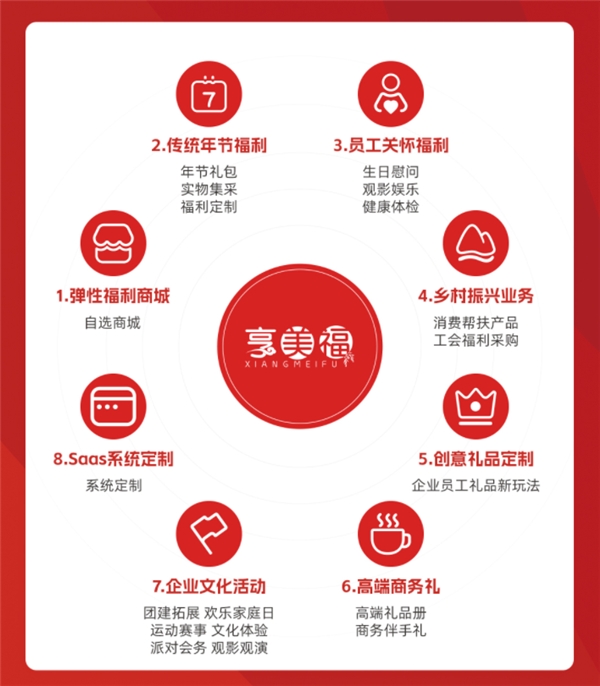 享美福除了企業(yè)活動定制之外,還有年節(jié)禮包、Saas系統(tǒng)定制、鄉(xiāng)村振興等業(yè)務。通過全方位、多角度的企業(yè)福利方案打造,傳遞企業(yè)文化,展示企業(yè)的人文關(guān)懷。