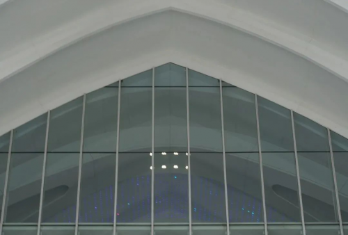 登錄廳“鳥喙”造型凈高34m,頂端懸挑長度達到6m。梁柱縱橫交錯、網(wǎng)狀交織。八局裝飾采用裝配式設(shè)計施工方法,現(xiàn)場組裝、單元吊裝、多條安裝線流水施工,完成1400塊雙曲異形超長鋁板快速安裝,輔以9953盞Dmax-512系統(tǒng)RGBW調(diào)光燈,營造流光溢彩的視覺效果,讓建筑空間更具藝術(shù)特性。