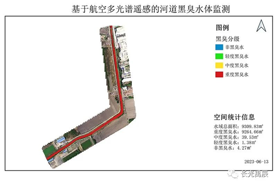 由上圖可以看出,該河道存在嚴(yán)重的黑臭現(xiàn)象,與地面實(shí)測參數(shù)和現(xiàn)場感官情況保持一致,無人機(jī)多光譜遙感進(jìn)行基于水色與濁度的評估精度較高。