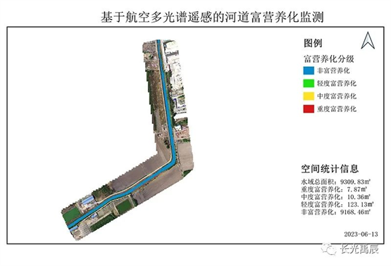 水體富營養(yǎng)化是指水中營養(yǎng)物質(zhì)(如氮、磷)過度積累,導(dǎo)致水體中藻類、水生植物大量繁殖的現(xiàn)象。水體富營養(yǎng)化會造成藻類過度生長,破壞水生態(tài)系統(tǒng)的平衡,甚至引發(fā)水體死亡。通過無人機(jī)多光譜遙感技術(shù),結(jié)合實(shí)測水質(zhì)參數(shù)數(shù)據(jù)的分析,對本次實(shí)驗(yàn)河道水體富營養(yǎng)化的識別情況如圖4所示。