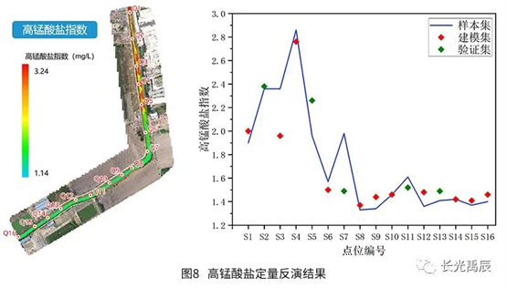 精度評定結(jié)果見表2.各水質(zhì)參數(shù)的平均相對誤差均在25%以下,可滿足常態(tài)化、高頻次的全局水質(zhì)檢測需求?;瘜W(xué)需氧量反演誤差稍大是因?yàn)樵摋l河道整體水質(zhì)情況存在較大的空間異質(zhì)性,河道不同河段中有機(jī)物含量差異較大,而水體化學(xué)需氧量與有機(jī)物濃度密切相關(guān),所以這種變化較快的梯度可能會引入一定的誤差,模型也有繼續(xù)優(yōu)化的空間。