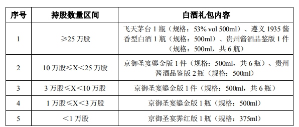 根據活動安排,吉宏股份持股25萬股以上的股東收到的白酒禮包將包括:飛天茅臺1瓶(規(guī)格:53%?vol?500ml)、遵義1935醬香型白酒1瓶(規(guī)格:500ml)、貴州醬酒品鑒版1件(規(guī)格:500ml,共6瓶)。