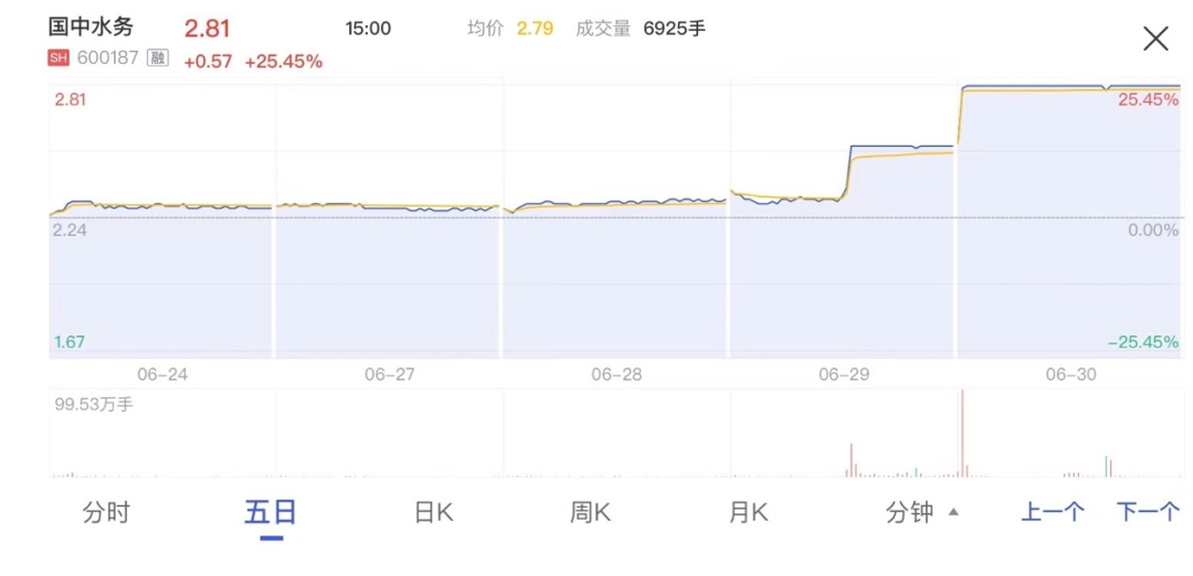 數(shù)據(jù)顯示,6月29日和30日,主營業(yè)務(wù)為污水處理、自來水供應(yīng)和環(huán)保工程技術(shù)服務(wù)的國中水務(wù)股價連續(xù)兩日收于漲停,因有市場消息稱“公司未來可能通過重組注入?yún)R源果汁”。