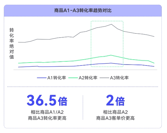 此外,商品5A從生意結(jié)果出發(fā),建立了人群商品行為和生意的關(guān)聯(lián)。其中,商品A3的樞紐價值尤其值得關(guān)注。相比商品A1/A2,商品A3的轉(zhuǎn)化率高出36.5倍;相比商品A2,商品A3的客單價高出2倍。這意味著在抖音生態(tài)內(nèi),商品A3人群對商品的喜愛程度更高,且更愿意購買該商品。品牌商家可以重點(diǎn)錨定商品A3人群進(jìn)行種草,放大營銷效果,在市場競爭中占據(jù)優(yōu)勢。