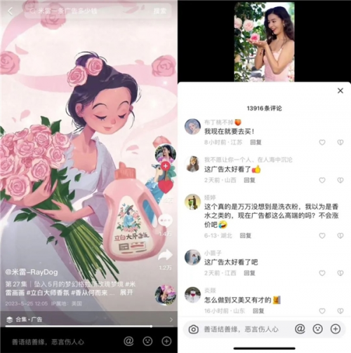這條視頻中,一位身穿連衣裙的漫畫少女,抱著一大束粉色玫瑰花,轉(zhuǎn)眼間漫畫中的女孩就成為了真人博主,整個視頻中充滿了浪漫夢幻的少女情懷?!懊繌埗歼m合做壁紙”“不自覺的上揚嘴角”......大家對這條內(nèi)容豐富的商業(yè)推廣視頻,表現(xiàn)出了極強的寬容度,甚至連連贊賞。
