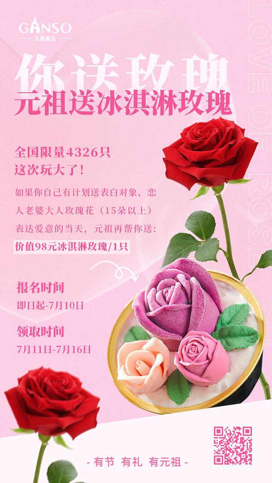 你送玫瑰,元祖送冰淇淋玫瑰,全國(guó)限量4326只!如果你有計(jì)劃送表白對(duì)象、戀人、妻子玫瑰花(15朵以上)表達(dá)愛(ài)意,元祖當(dāng)天再幫你送價(jià)值98元冰淇淋玫瑰。此活動(dòng)一經(jīng)發(fā)布,元祖粉絲紛紛報(bào)名參與,迅速在社交媒體上掀起了一股“浪漫熱潮”!