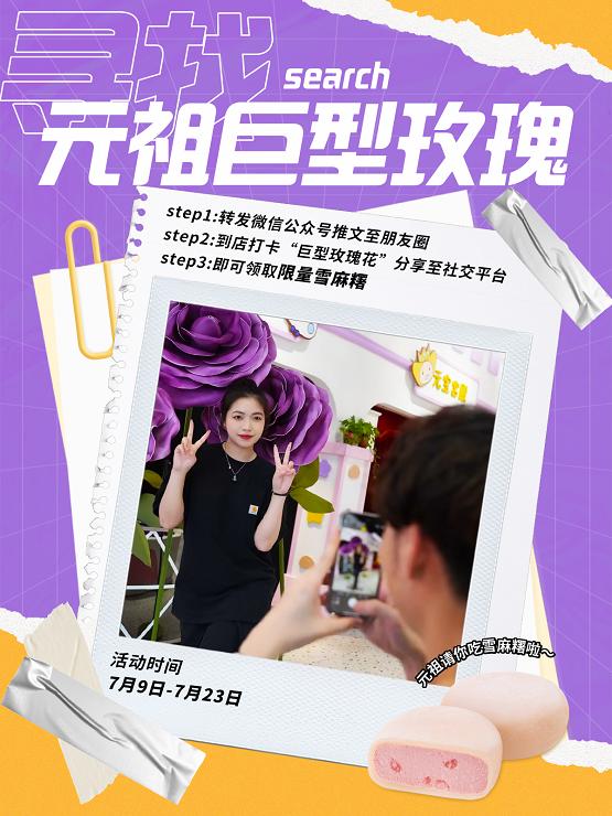 7月9日-7月23日,轉(zhuǎn)發(fā)元祖食品官方微信公眾號(hào)巨型玫瑰活動(dòng)推文,并到店尋找“巨型玫瑰花”,拍照打卡分享至社交平臺(tái)(小紅書(shū)、抖音、微博等),即可領(lǐng)取限量雪麻糬,超多驚喜福利,點(diǎn)燃夏日激情。