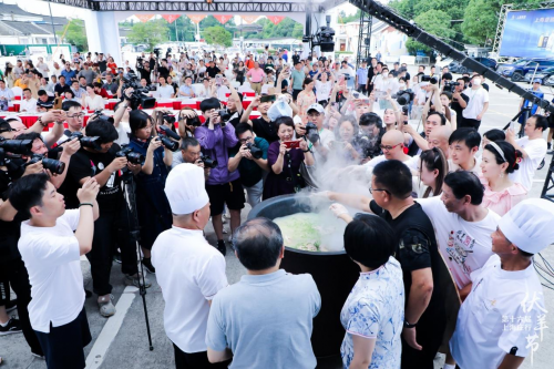 最后,奉賢區(qū)委、新民晚報、東方廣播中心、東方網(wǎng)、區(qū)融媒體中心、區(qū)文旅局、區(qū)農(nóng)委、莊行鎮(zhèn)及上海貴酒的領(lǐng)導共同開啟注水儀式,手持水瓶緩緩澆在寫有“第十六屆上海莊行伏羊節(jié)正式啟動”字的模具里,將開幕式的儀式感徹底拉滿。