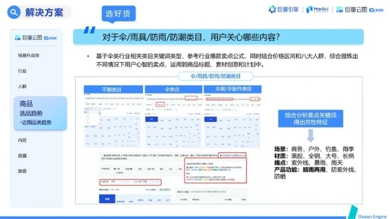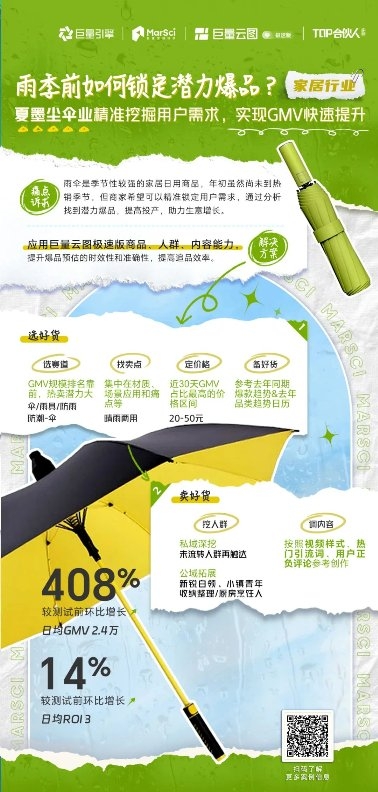 作為家居百貨行業(yè)代表,雨傘品類季節(jié)性更強(qiáng),上述問題也更為凸顯,年初雖然尚未到雨季熱銷節(jié)點,但工廠希望可以精準(zhǔn)鎖定用戶需求,提前儲備新的爆品,未雨綢繆。如何準(zhǔn)確選出潛力爆品,并篩選精準(zhǔn)人群提高投產(chǎn),助力生意增長?