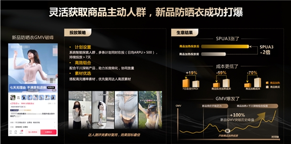 某防曬衣品牌正是直擊商品粒度的主動人群,搭配高完播率素材,將新品防曬衣成功打爆。SPUA3漲了2倍,新品GMV增長超過100%,突破歷史峰值。