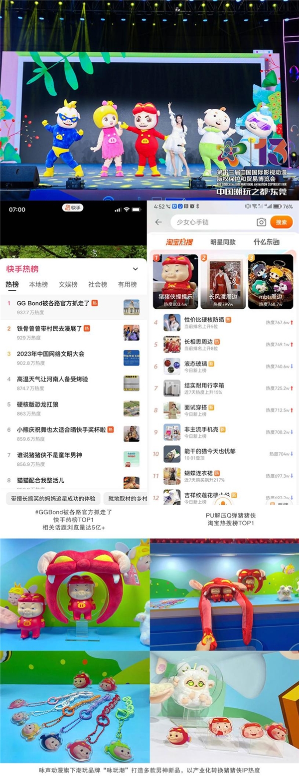 本次展會上,豬豬俠率領(lǐng)小伙伴們亮相國漫國潮嘉年華,精彩的現(xiàn)場表演吸引了眾多觀眾圍觀。今年,豬豬俠表情包在各大平臺高頻次曝光,眾多網(wǎng)友以自發(fā)模仿、二創(chuàng)等方式傳播GGBond表情包,男神GGBond相關(guān)話題多次登上抖音、快手、微博等各平臺熱榜。同時,詠聲動漫迅速推出相應(yīng)衍生品承接熱點,實現(xiàn)營銷變現(xiàn)。