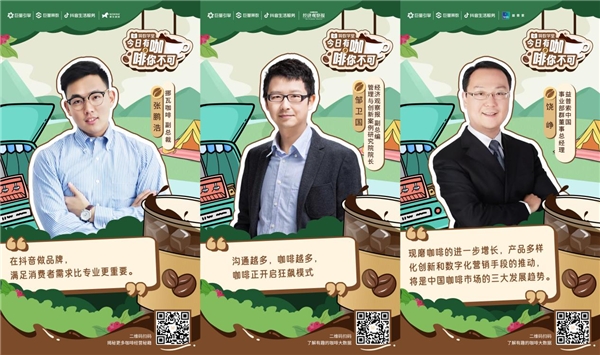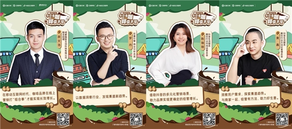 為此《算數(shù)學堂》重磅推出《今日有咖·啡你不可》欄目,聚焦咖啡賽道,為品牌商家們指點迷津,并邀請了8位重磅嘉賓,專業(yè)覆蓋咖啡生態(tài)各個環(huán)節(jié),包括消費行業(yè)專家2位、咖啡品牌商家代表2家、品牌代理服務(wù)商1家、抖音生活服務(wù)專家2位、巨量引擎商業(yè)分析1位,他們將分別從各自的領(lǐng)域出發(fā),分享有關(guān)咖啡行業(yè)未來趨勢、品牌經(jīng)營方法論、抖音平臺數(shù)字化營銷秘籍等真知灼見。