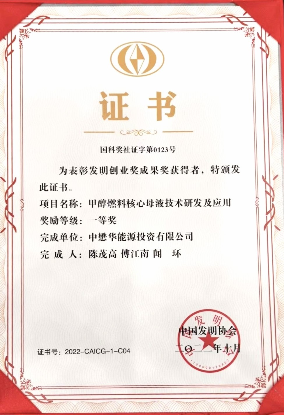 4月25日,由中國(guó)發(fā)明協(xié)會(huì)、科技日?qǐng)?bào)社、國(guó)家科學(xué)技術(shù)獎(jiǎng)勵(lì)工作辦公室、中國(guó)知識(shí)產(chǎn)權(quán)報(bào)社共同舉辦的第十七屆中國(guó)發(fā)明家論壇暨發(fā)明創(chuàng)業(yè)獎(jiǎng)?lì)C獎(jiǎng)典禮在京舉行。第十屆全國(guó)人大常委會(huì)副委員長(zhǎng)、中國(guó)關(guān)心下一代工作委員會(huì)主任顧秀蓮,科學(xué)技術(shù)部黨組成員、副部長(zhǎng),中國(guó)發(fā)明協(xié)會(huì)理事長(zhǎng)吳朝暉,國(guó)家知識(shí)產(chǎn)權(quán)局專利局副局長(zhǎng)王嵐?jié)阮I(lǐng)導(dǎo)出席為獲獎(jiǎng)代表頒獎(jiǎng)。會(huì)上由中懋華能源投資有限公司完成的“甲醇燃料核心母液技術(shù)研發(fā)及應(yīng)用”技術(shù)成果榮獲發(fā)明創(chuàng)業(yè)獎(jiǎng)成果獎(jiǎng)一等獎(jiǎng),中懋華能源投資有限公司董事長(zhǎng)陳茂高作為獲獎(jiǎng)代表出席頒獎(jiǎng)典禮。
