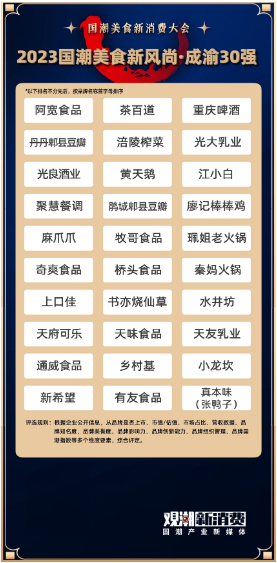 國潮品牌之夜是一場專屬中國美食品牌的加冕之夜。在借由盛典彰顯國潮美食風尚之余,觀潮新消費還發(fā)布了《2023國潮美食新風尚·成渝30強》,旨在打造成渝核心企業(yè)標桿,描繪區(qū)域食品工業(yè)發(fā)展藍圖,為進一步推動企業(yè)創(chuàng)新、深化產(chǎn)業(yè)合作、實現(xiàn)成渝經(jīng)濟高質(zhì)量發(fā)展提供參考。