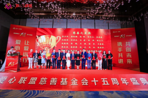 下午,愛心聯(lián)盟慈善基金會(huì)成立十五周年盛典隆重舉行。全國(guó)勞動(dòng)模范、全國(guó)五一勞動(dòng)獎(jiǎng)?wù)芦@得者、全國(guó)道德模范、吉林省工商聯(lián)副主席、吉林省河南商會(huì)會(huì)長(zhǎng)、愛心聯(lián)盟慈善基金會(huì)理事長(zhǎng)李萬(wàn)升,河南省政府駐上海辦副主任胡華杰,哈爾濱市政府駐上海辦經(jīng)協(xié)處處長(zhǎng)田磊,中國(guó)浦東干部學(xué)院黨建研究中心主任吳濤,上海中信國(guó)旅總經(jīng)理羅良剛,山東馳恒投資發(fā)展有限公司董事長(zhǎng)王久紅,昆山物流協(xié)會(huì)會(huì)長(zhǎng)孫喜,來(lái)伊份股份有限公司高級(jí)副總裁趙漢利,新希望集團(tuán)草根資本投資部部長(zhǎng)許云龍,上海歐邦醫(yī)療管理有限公司創(chuàng)始人崔海茹,眼界(上海)健康管理有限公司創(chuàng)始人謝攖寧,浙江省有機(jī)產(chǎn)業(yè)協(xié)會(huì)理事長(zhǎng)胡珊,上海妃魚股份高級(jí)副總裁李財(cái)鋒,愛心聯(lián)盟慈善基金會(huì)執(zhí)行理事長(zhǎng)楊崢,以及上海市工商聯(lián)直屬商會(huì)和各省市在滬異地商會(huì)秘書長(zhǎng)等來(lái)自全國(guó)各地的精英和愛心聯(lián)盟成員300余人歡聚一堂,共同慶祝愛心聯(lián)盟慈善基金會(huì)成立十五周年。