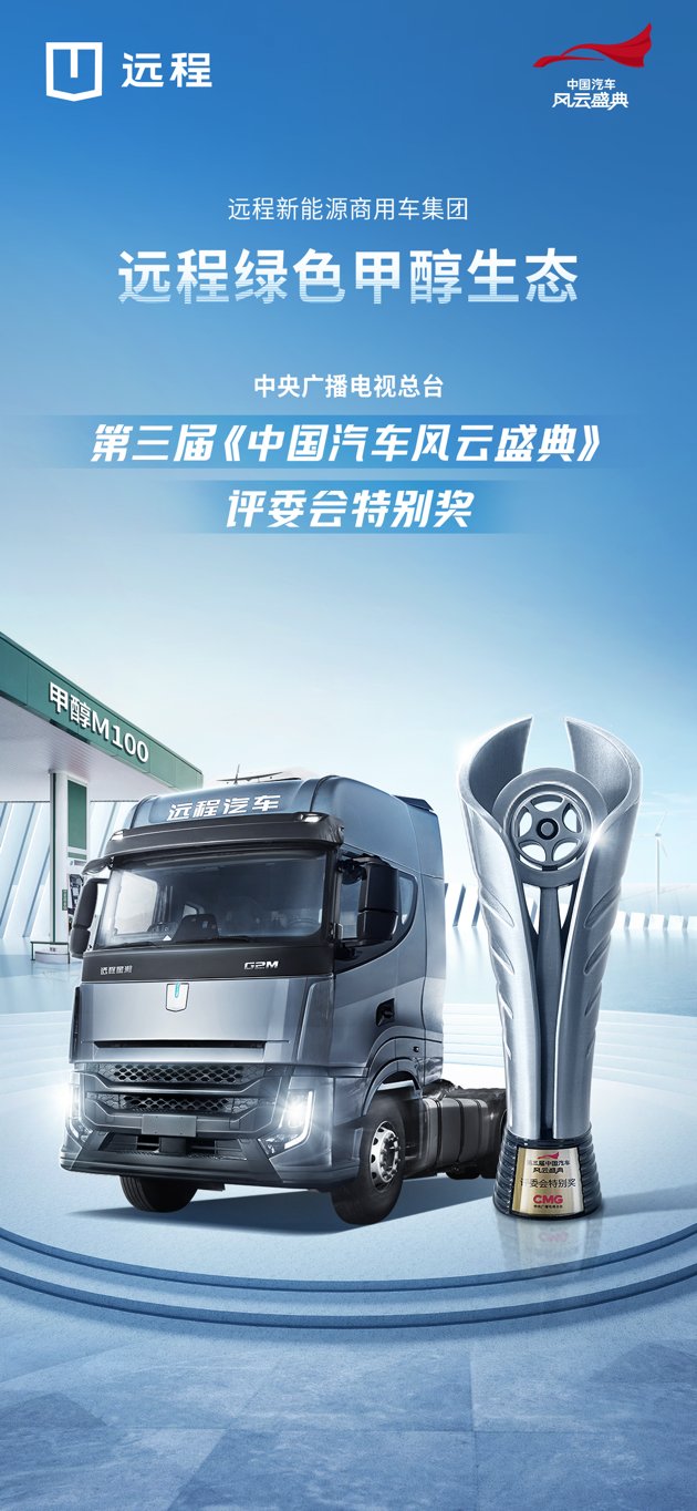 2023年4月7日,在中央廣播電視總臺(tái)主辦的第三屆《中國汽車風(fēng)云盛典》頒獎(jiǎng)典禮上,遠(yuǎn)程綠色甲醇生態(tài)榮獲評(píng)委會(huì)特別獎(jiǎng),成為首個(gè)以商用車為主體的獲獎(jiǎng)企業(yè)。
