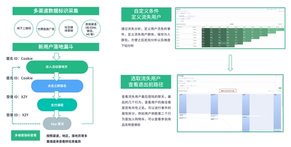 第二,接得住,即流量承接方式的優(yōu)化效率。投放物料效果的好壞,會(huì)直接影響轉(zhuǎn)化率和獲客成本,最合理的評(píng)估方式是通過 A/B 測(cè)試,快速迭代和優(yōu)化落地頁(yè)。另外,神策數(shù)據(jù)職業(yè)教育 & 素質(zhì)教育解決方案能夠?qū)崿F(xiàn)新用戶從站外到站內(nèi)行為路徑貫通,有效定位線索流失原因,進(jìn)而調(diào)整承接策略。