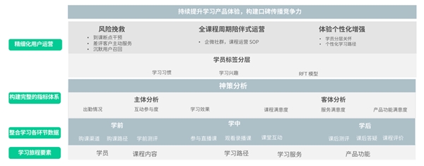 教培機(jī)構(gòu)的口碑依賴于學(xué)員對(duì)課程服務(wù)的評(píng)價(jià),因此,基于學(xué)習(xí)主體與客體的全面分析,是改進(jìn)課程、驅(qū)動(dòng)學(xué)習(xí)產(chǎn)品體驗(yàn)升級(jí)的重要依據(jù)。