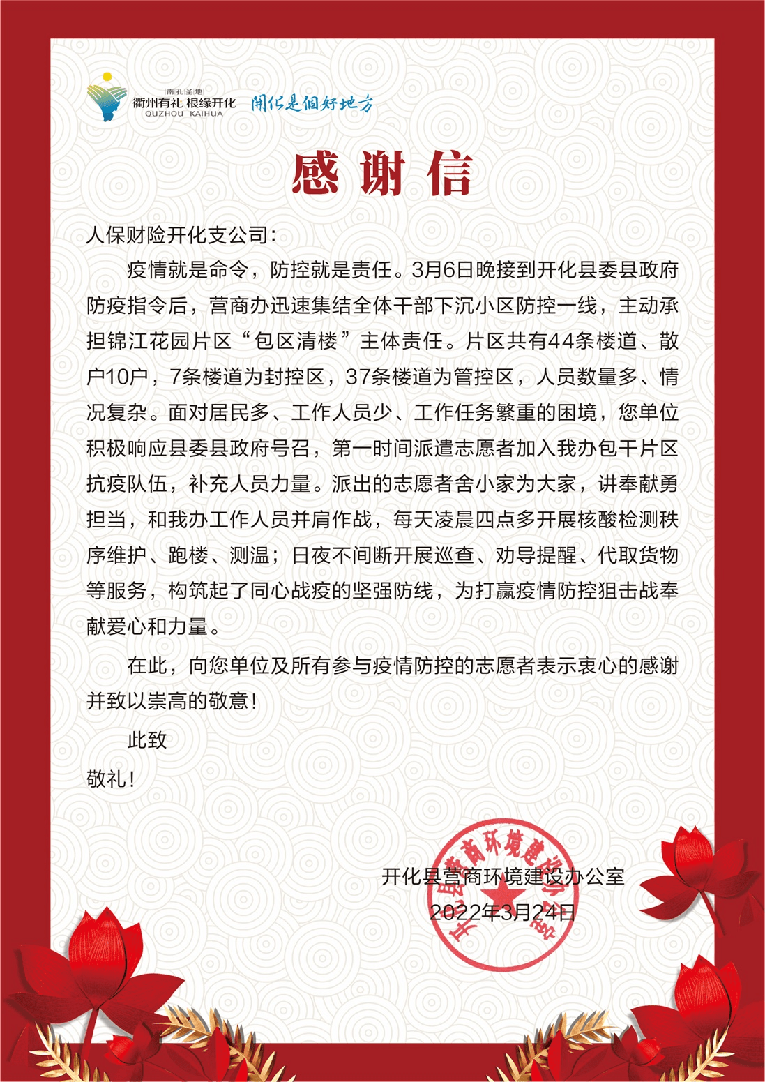 開化縣營商環(huán)境建設(shè)辦公室為開化人保財險支持抗疫送上的感謝信。