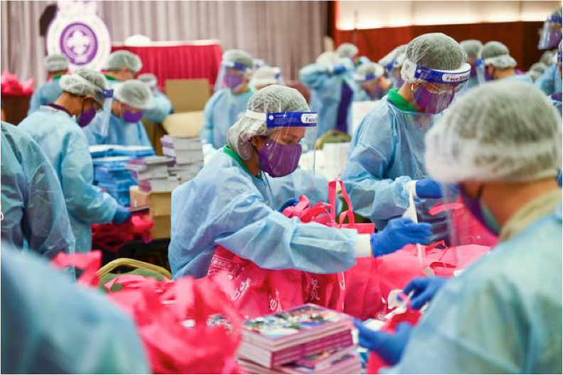 香港童軍總會(huì)義工包裝抗疫包。(圖片來(lái)源:青少年抗疫連線(xiàn))