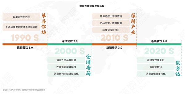 中國(guó)連鎖餐飲發(fā)展經(jīng)歷了“單店作坊、全國(guó)布局、深耕產(chǎn)業(yè)、數(shù)字化”四個(gè)階段,目前已經(jīng)進(jìn)入 4.0 數(shù)字化階段,呈現(xiàn)線(xiàn)上化、零售化、消費(fèi)者偏好多元化的趨勢(shì)。