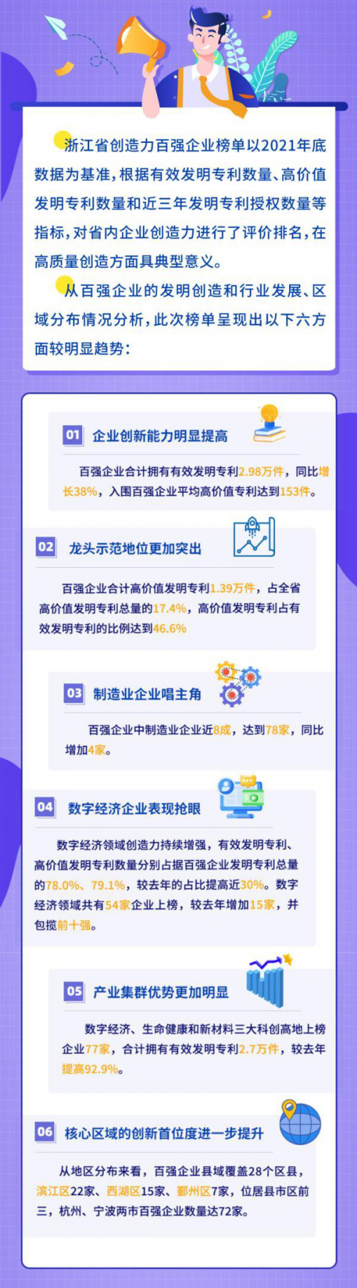 “百強企業(yè)合計擁有有效發(fā)明專利2.98萬件,同比增長38%。入圍百強企業(yè)平均高價值專利達到153件,合計高價值發(fā)明專利共1.39萬件,占全省高價值發(fā)明專利總量的17.4%。”浙江省市場監(jiān)管局相關(guān)負責人表示。