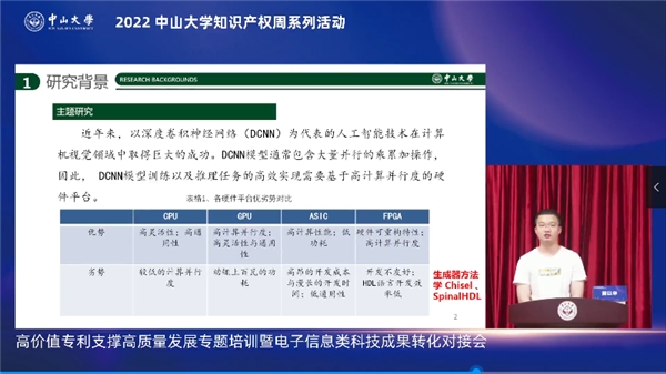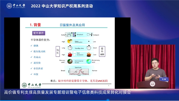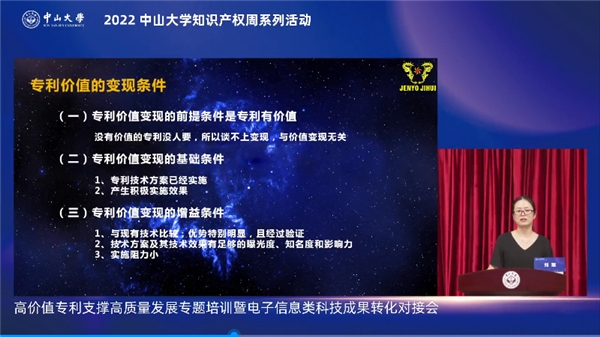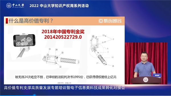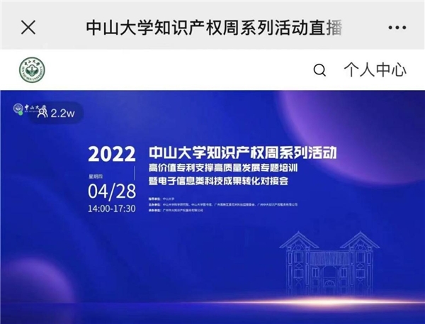 2022年4月28日,在中山大學(xué)的全程指導(dǎo)及越秀區(qū)政府的鼎力支持下,中山大學(xué)科學(xué)研究院、廣州高新區(qū)黃花崗科技園管委會、中山大學(xué)圖書館、廣州中大知識產(chǎn)權(quán)服務(wù)有限公司共同成功主辦中山大學(xué)知識產(chǎn)權(quán)周系列活動高價值專利支撐高質(zhì)量發(fā)展專題培訓(xùn)暨電子信息類科技成果轉(zhuǎn)化對接會。本次活動采取線上方式開展,邀請兩位業(yè)界專家圍繞高價值專利支撐高質(zhì)量發(fā)展做專題報告,多達178項電子信息類專利項目與83家企業(yè)進行了精準(zhǔn)對接,活動在線人數(shù)超2.2萬人,多位知識產(chǎn)權(quán)專家及知名企業(yè)在云端匯聚,助力知識產(chǎn)權(quán)高質(zhì)量發(fā)展。