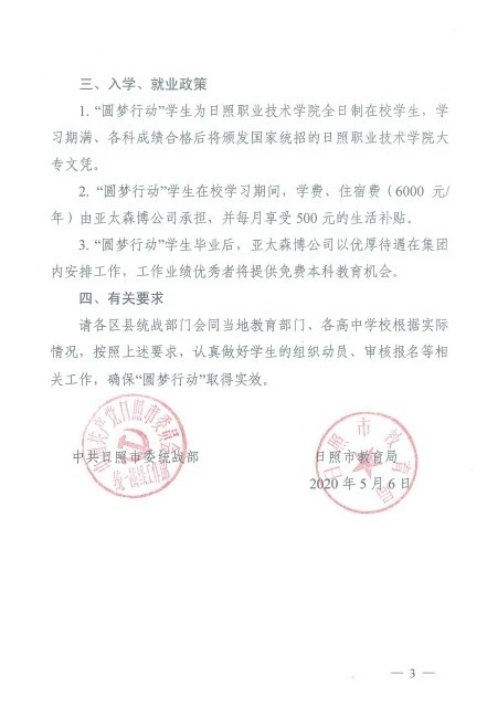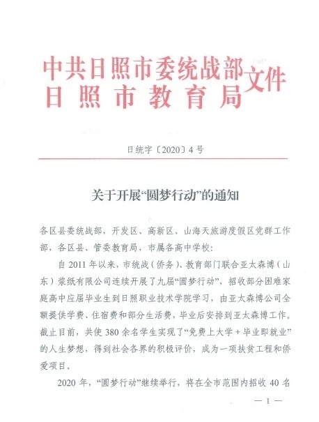 2011年,亞太森博與統(tǒng)戰(zhàn)部門合作開展的“圓夢行動”正式啟動。亞太森博出資,統(tǒng)戰(zhàn)協(xié)調(diào)教育部門出政策,與大學(xué)合作,為考上大學(xué)的家庭貧困高中生解決學(xué)費(fèi)、生活費(fèi),圓夢大學(xué)。