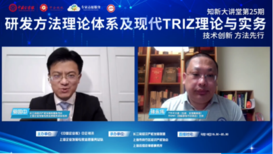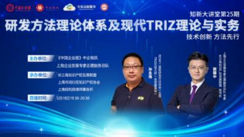 5月18日,中企視訊《知新大講堂》第25期節(jié)目線上開播。RDMI(國(guó)際研發(fā)方法協(xié)會(huì))主席、TRIZ五級(jí)大師(全球最高級(jí))、DFSS(六西格瑪設(shè)計(jì))黑帶大師孫永偉博士做客中企視訊直播間,長(zhǎng)三角知識(shí)產(chǎn)權(quán)發(fā)展聯(lián)盟秘書長(zhǎng)郭國(guó)中擔(dān)任主持人,介紹了現(xiàn)代TRIZ理論體系的組成以及它在技術(shù)創(chuàng)新、新產(chǎn)品研發(fā)、專利布局、規(guī)避、挖掘等專利戰(zhàn)略、運(yùn)用創(chuàng)新大幅降本等方面的重要作用。