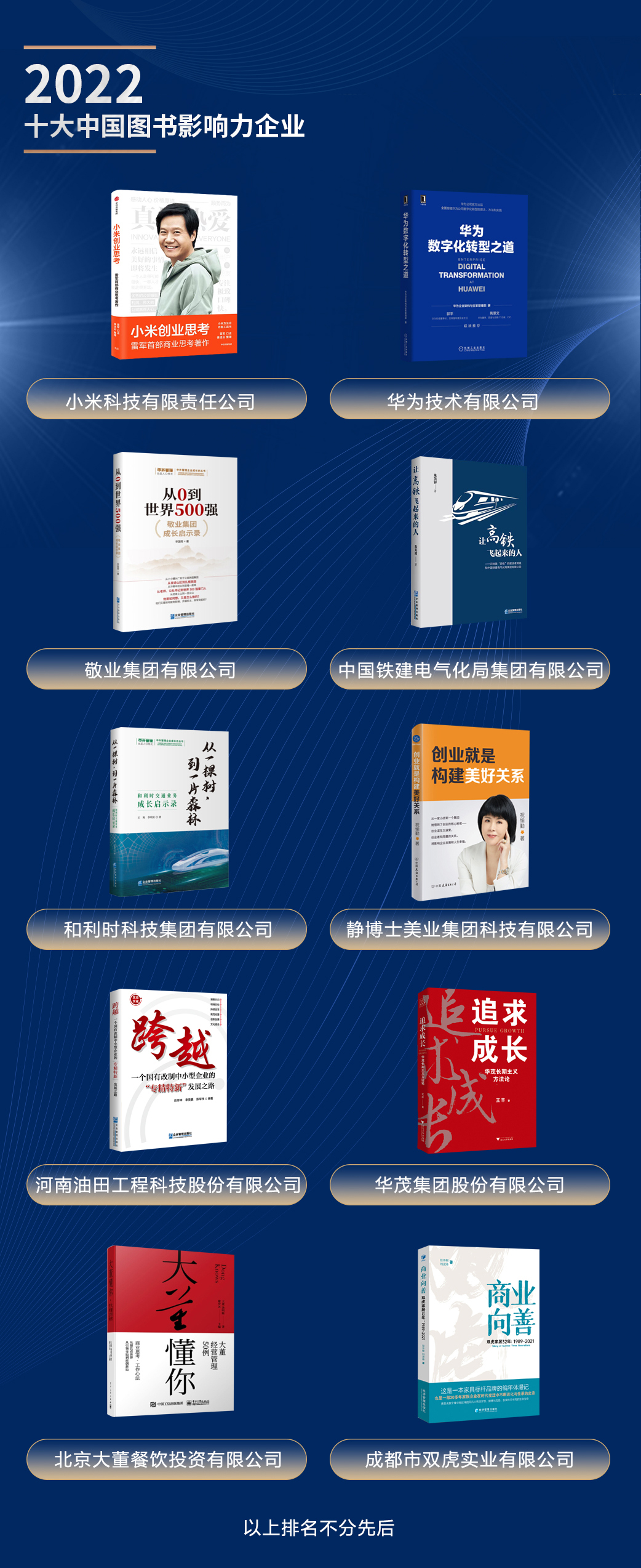 獲得“2022十大中國圖書影響力企業(yè)”,上榜企業(yè)包括:小米、華為、敬業(yè)、和利時(shí)、靜博士、華茂、大董、雙虎、中國鐵建電氣化局、河南油田工程科技等。
