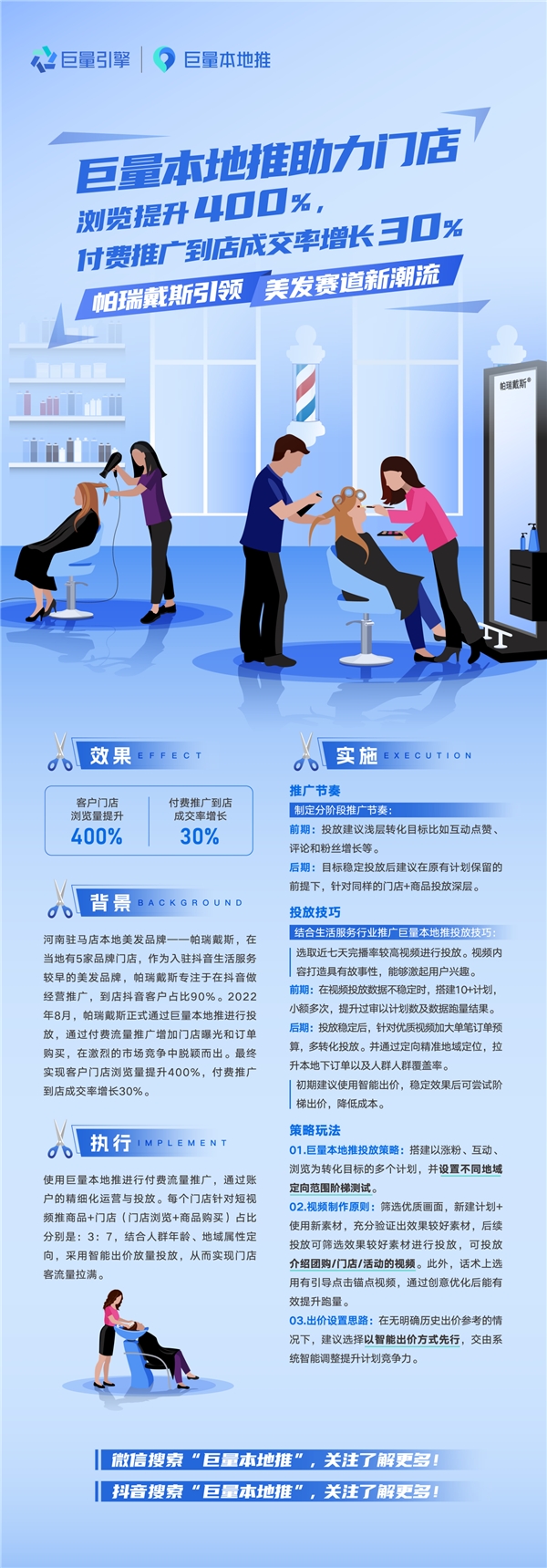 本地生意蘊藏著巨大商機,商家如何借助線上平臺或工具,挖掘更多增長機會呢?「巨量本地推」第二期極星案例大賽,正式揭曉最終獲獎案例榜,獲得「到綜」第一名的河南駐馬店本地美發(fā)品牌帕瑞戴斯,成功在諸多案例中脫穎而出,月均消耗提升4倍,付費推廣到店成交率增長30%,本地到店客戶源源不斷,給本地商家?guī)砹艘恍┰鲩L思路借鑒。