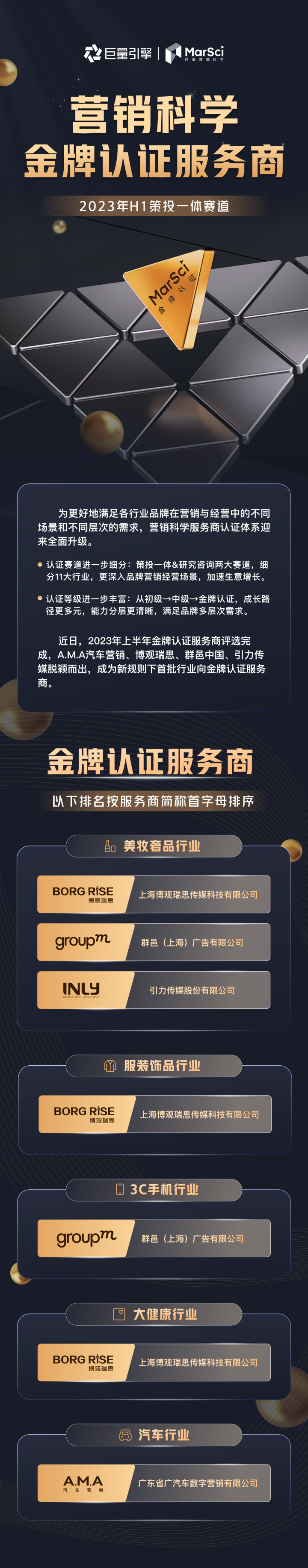 在新認(rèn)證規(guī)則下,經(jīng)過多輪的篩選和答辯,2023年H1“策投一體賽道”金牌認(rèn)證服務(wù)商評(píng)選于近日?qǐng)A滿結(jié)束,A.M.A汽車營(yíng)銷、博觀瑞思、群邑中國(guó)、引力傳媒四家優(yōu)秀的服務(wù)商伙伴脫穎而出,成為首批行業(yè)向金牌認(rèn)證服務(wù)商。