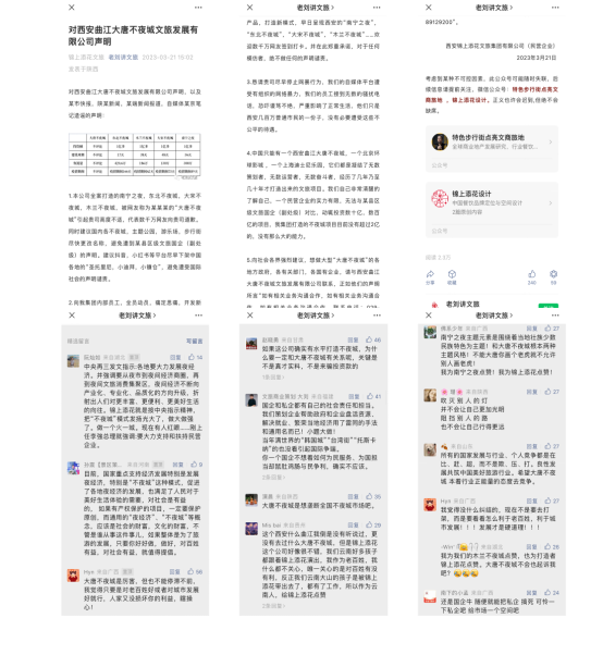 時隔5天后,錦上添花集團首次回應。3月21日,公眾號“老劉講文旅”(tsxz10000,認證信息為西安錦上添花裝飾設計工程有限公司小寨分公司)作為回應,發(fā)布了對西安曲江大唐不夜城文旅發(fā)展有限公司的聲明,以及對某市快報、陜某新聞、某端新聞報道、自媒體某京筆記造謠的聲明(詳見下圖):